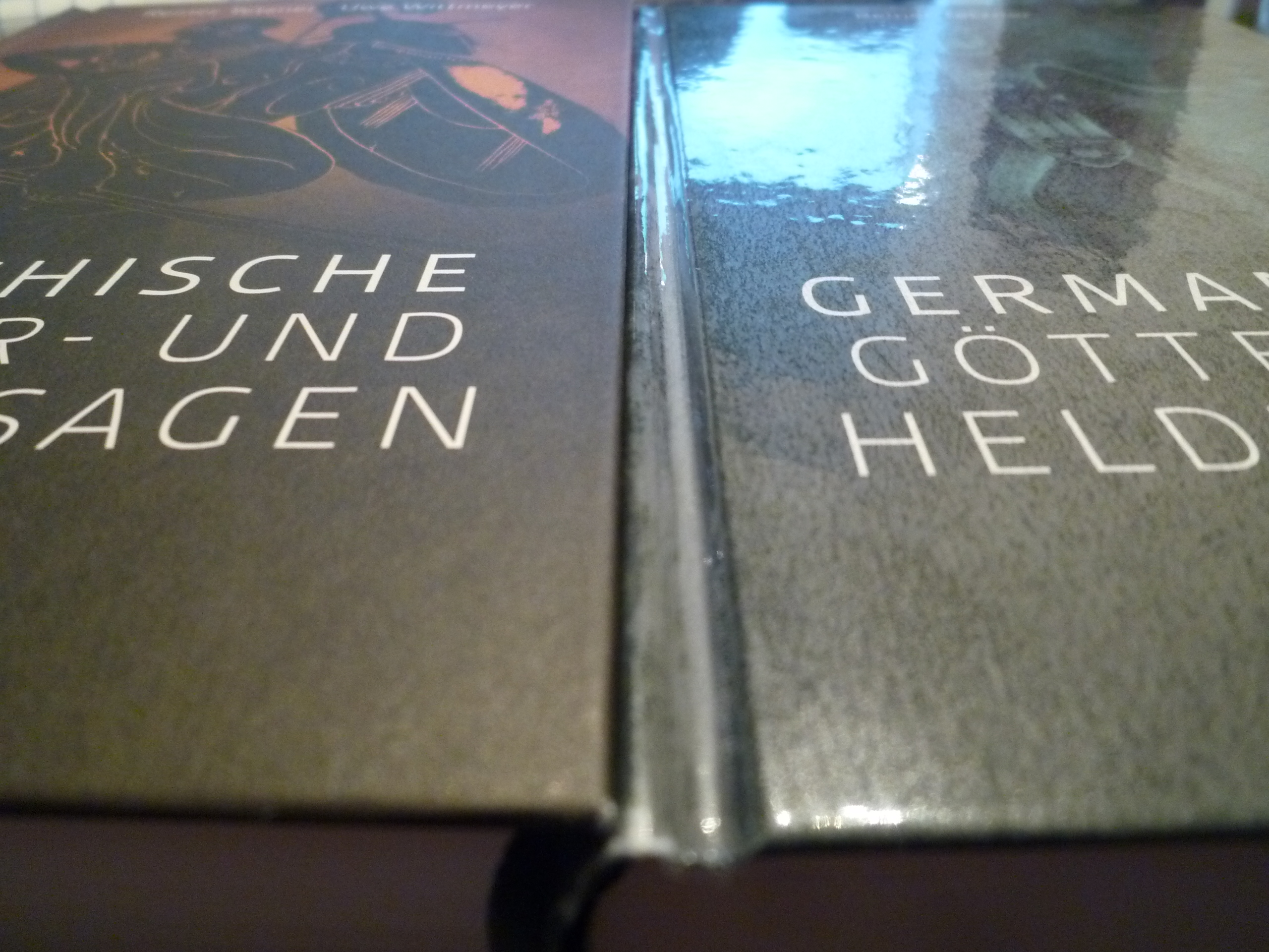 Reclam hat aus dem Kulturgut der Götter- und Heldensagen einen wunderbaren Schuber hergestellt. Um ihn noch haltbarer zu machen, hat der Buch- und Medienblog die beiden Bände noch foliert, damit die alten Götter und Helden nicht nur das Bücherregal hüten, sondern eine aktive Rolle einnehmen können.